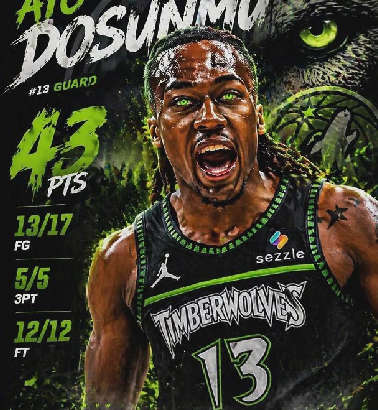 该场比赛森林狼主场112-96碾压掘金,目前系列赛3-1大比分领先已拿到赛点,替补出战的道苏姆扮演救世主,投篮17中13,其中三分5中5,罚球12中12狂轰43分。